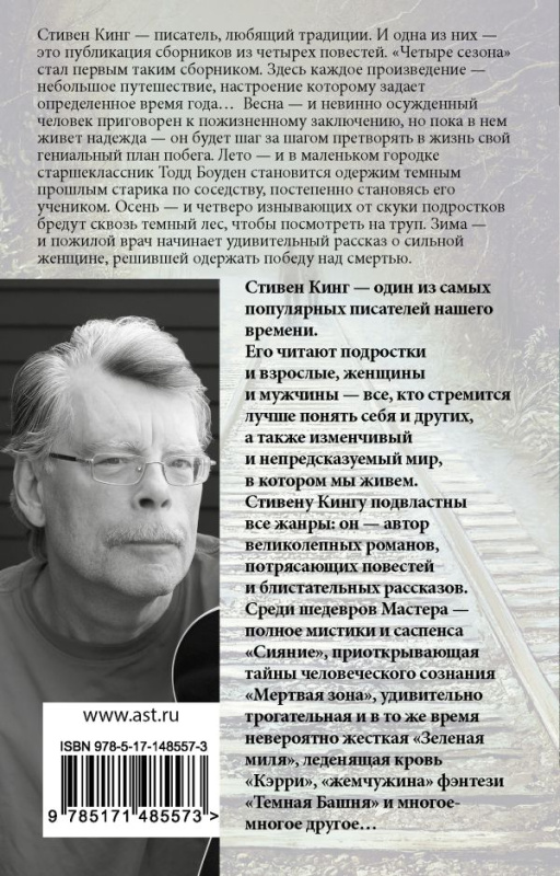 ОписаниеСтивен Кинг — писатель, любящий традиции. И одна из них — это публикация сборников, неизменно состоящих из четырех повестей. "Четыре сезона" стал первым таким сборником. Его заглавная повесть "Рита Хэйворт и побег из Шоушенка" легла в основу легендарного фильма Фрэнка Дарабонта с Тимом Роббинсом и Морганом Фриманом в главных ролях.