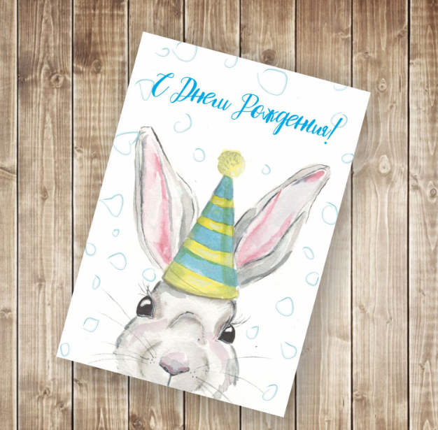 ----Открытка А6 С днем рождения! одинарная (кролик в колпаке) ПО 41