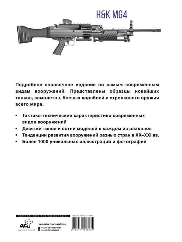 ОписаниеВ книге представлены образцы современной бронетехники, самолетов и вертолетов, стрелкового оружия и боевых кораблей. Она содержит тысячи уникальных рисунков и фотографий, детальные схемы, тактико-технические характеристики и описания моделей боевой техники и оружия, охватывающие период с момента окончания Второй мировой войны до нашего времени. Книга адресована всем интересующимся историей вооружений и их современным состоянием.