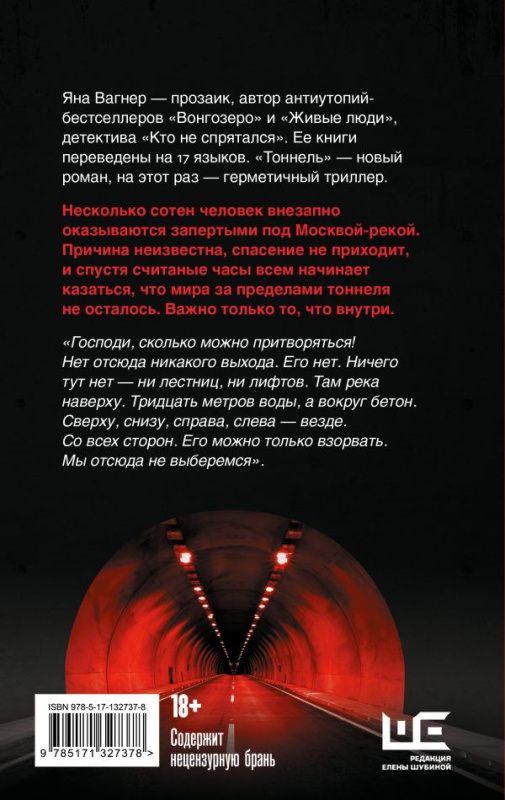 Яна Вагнер — прозаик, автор антиутопий‑бестселлеров «Вонгозеро» и «Живые люди», детектива «Кто не спрятался». Ее книги переведены на 17 языков. «Тоннель» — новый роман, на этот раз — герметичный триллер.