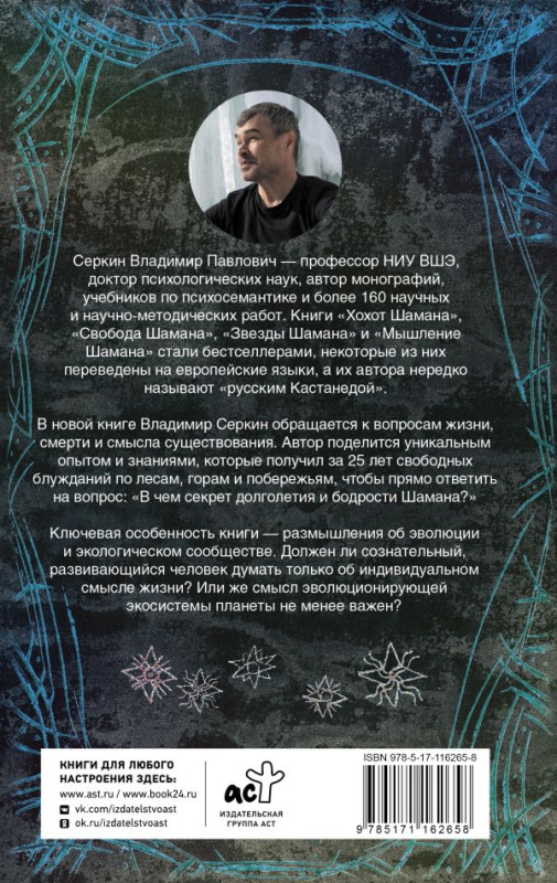 В новой книге Владимир Серкин обращается к вопросам жизни, смерти и смысла существования. Автор поделится уникальным опытом и знаниями, которые получил за 25 лет свободных блужданий по лесам, горам и побережьям, чтобы прямо ответить на вопрос: "В чем секрет долголетия и бодрости Шамана?"
